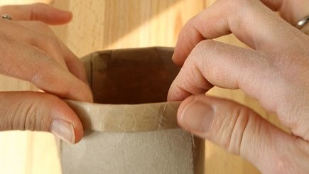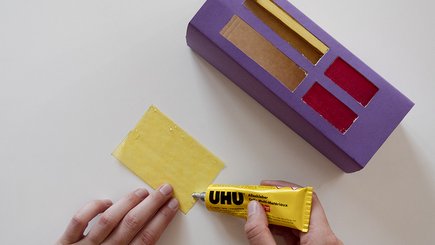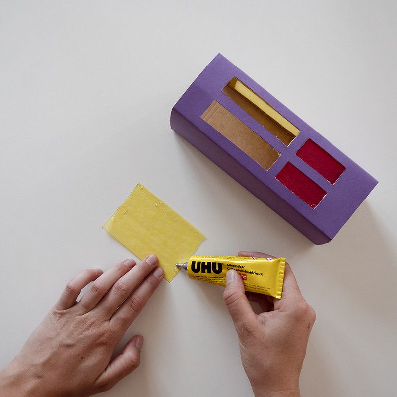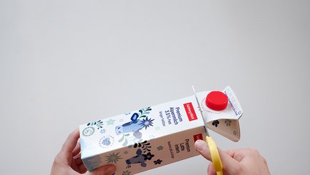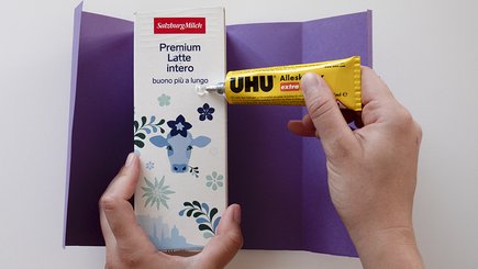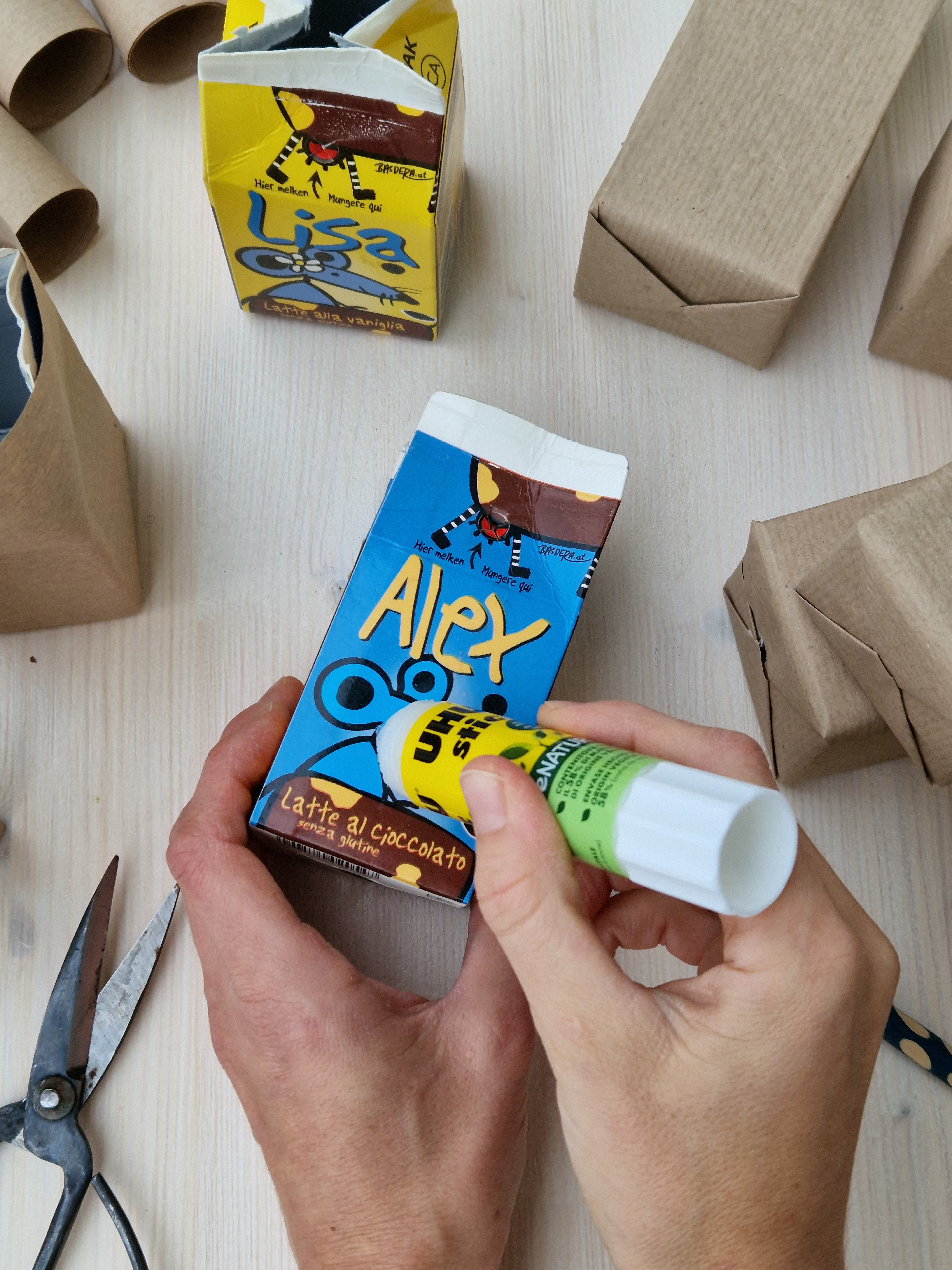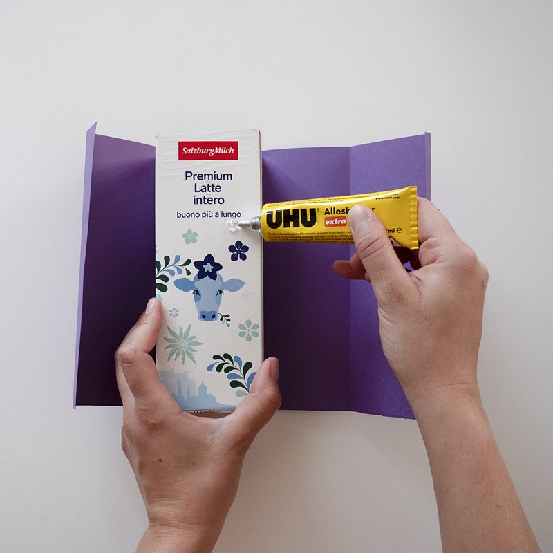 Packe die Milchpackung wie ein Geschenk in das Papier ein und befestige es mit Kleber