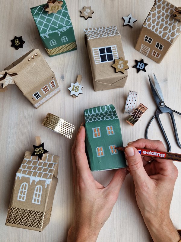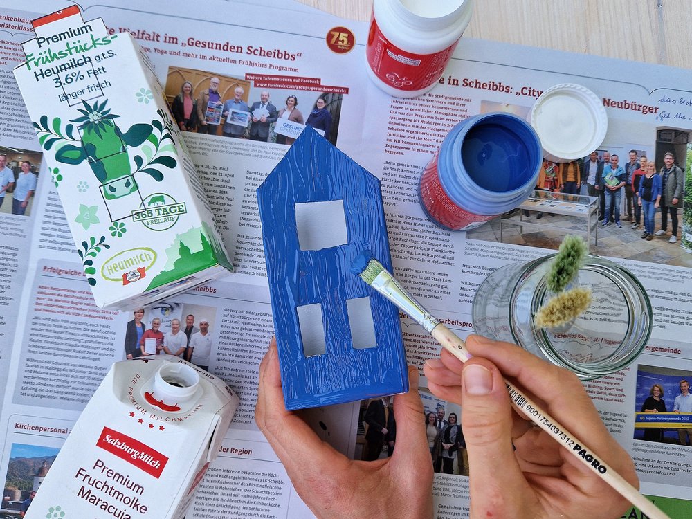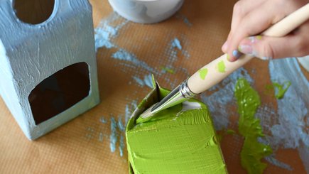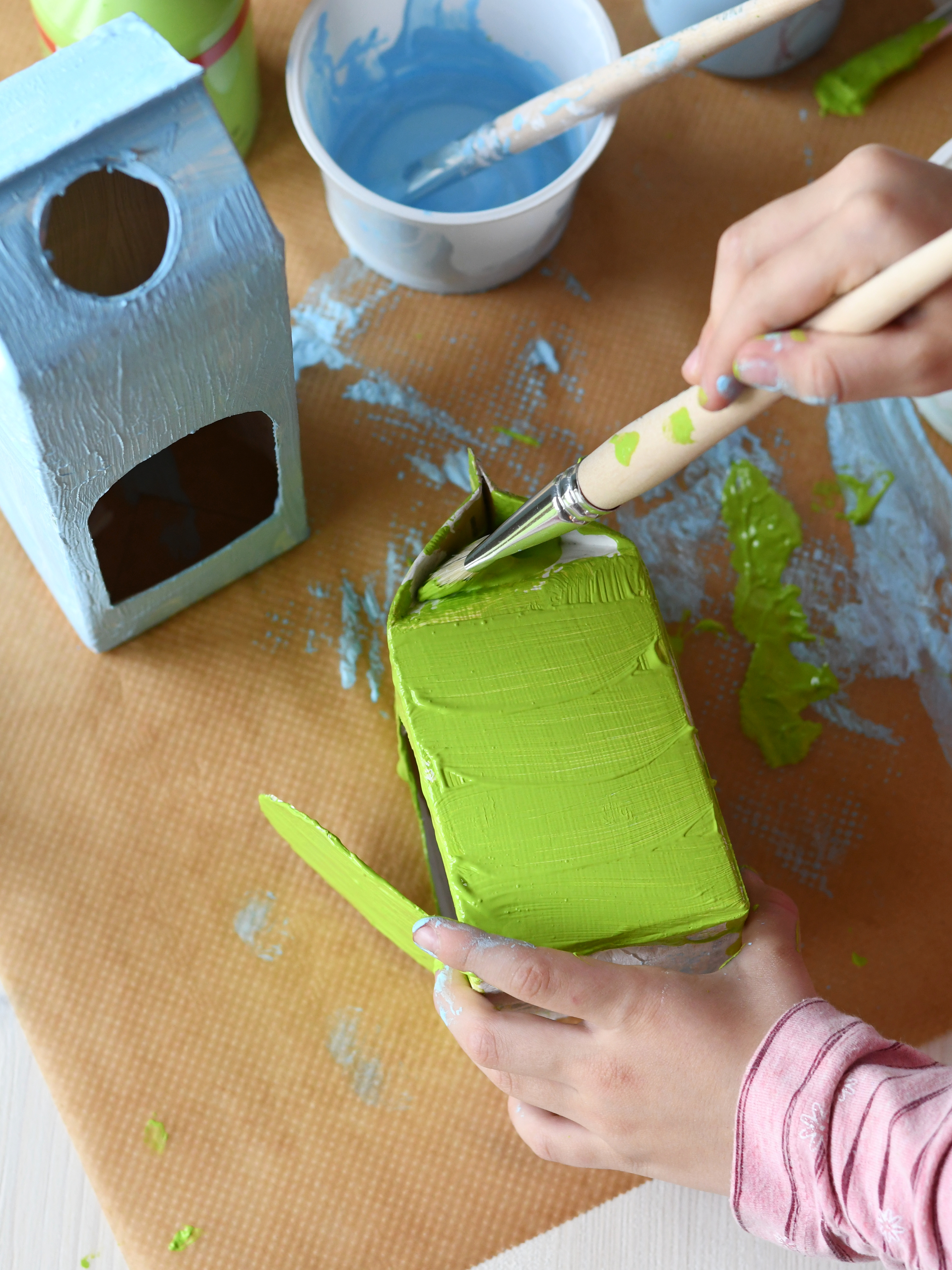 Bemale die Häuschen mit Acrylfarbe und lasse sie trocknen.