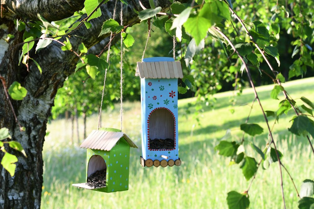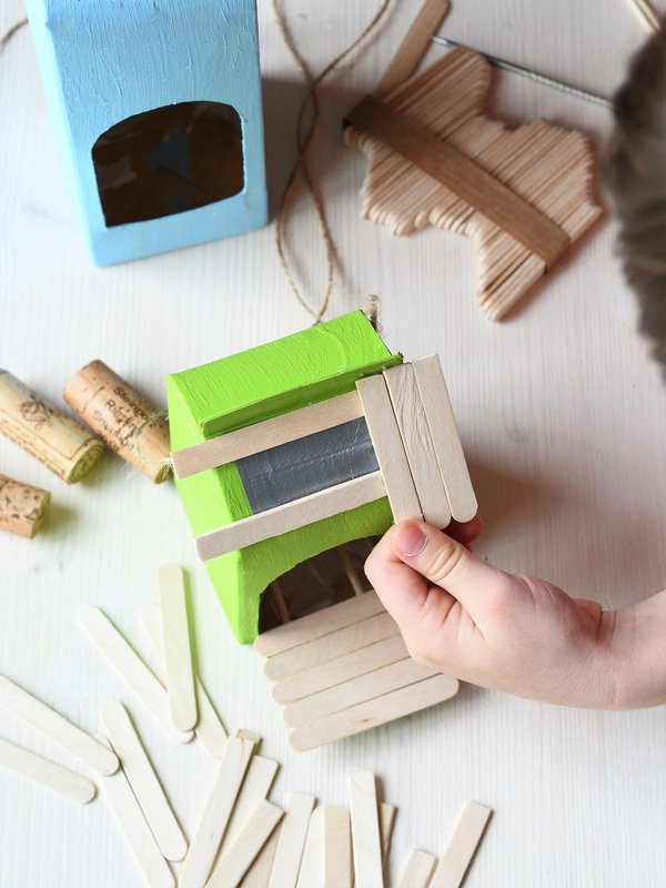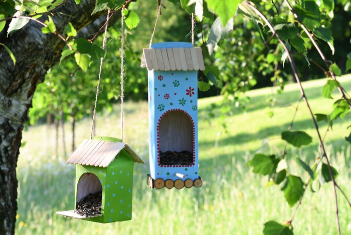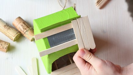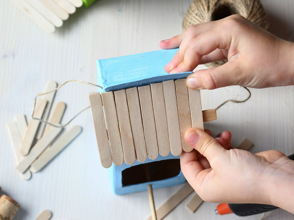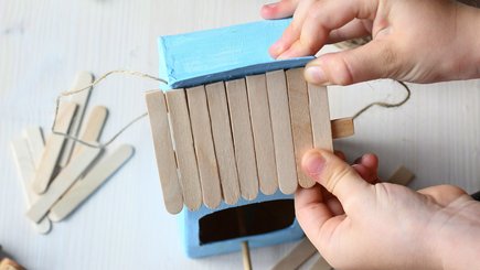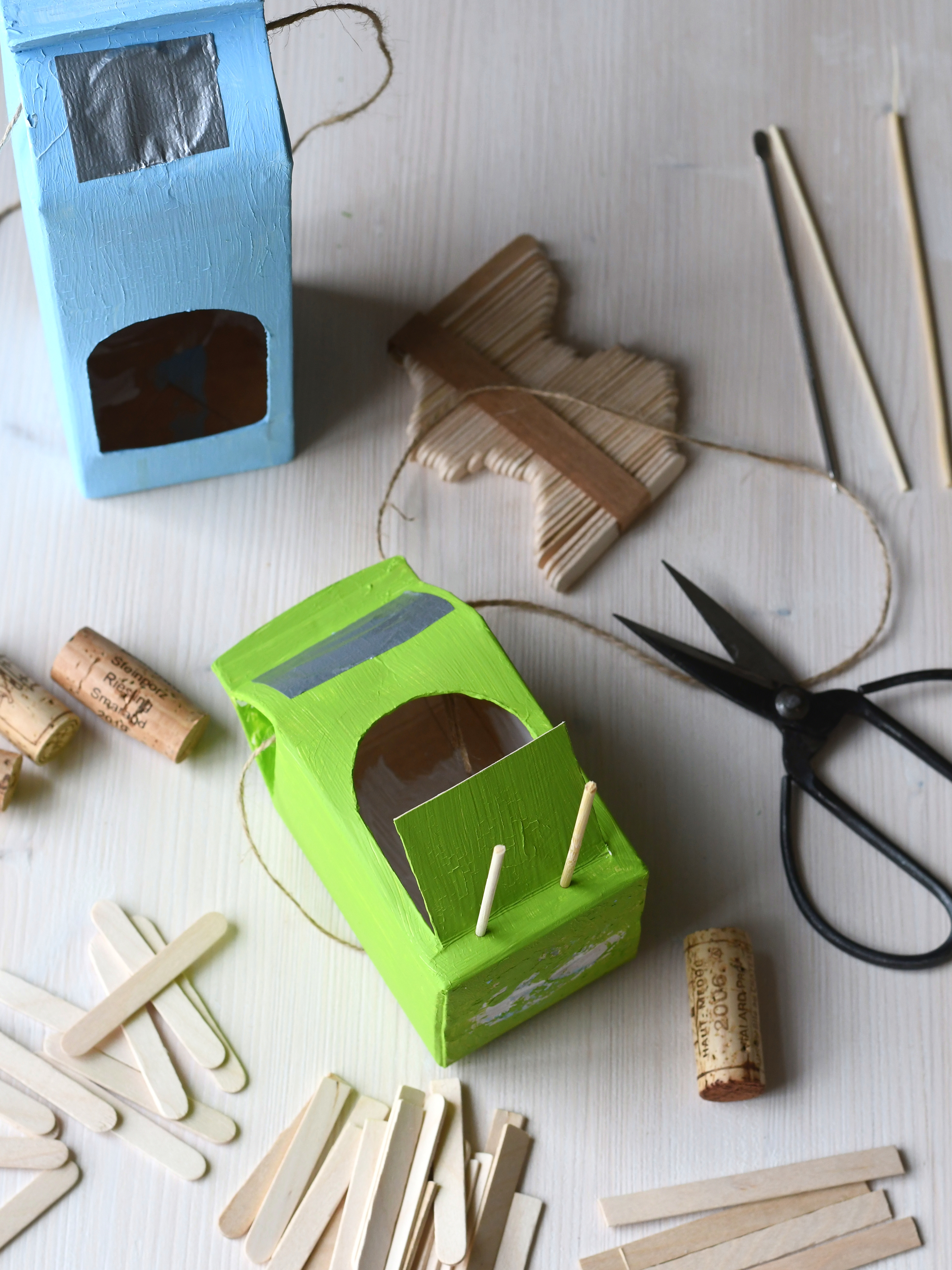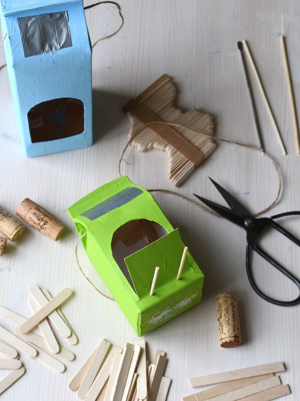 Im oberen Bereich der Milchtüte Löcher bohren und Haushaltsgarn zum Aufhängen durchfädeln. Dach und Balkon mit Eisstielen bekleben. Vogelhäuschen nach Belieben Verzieren.