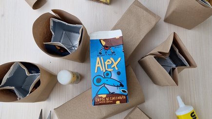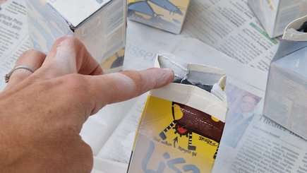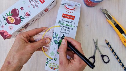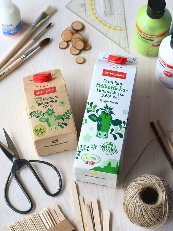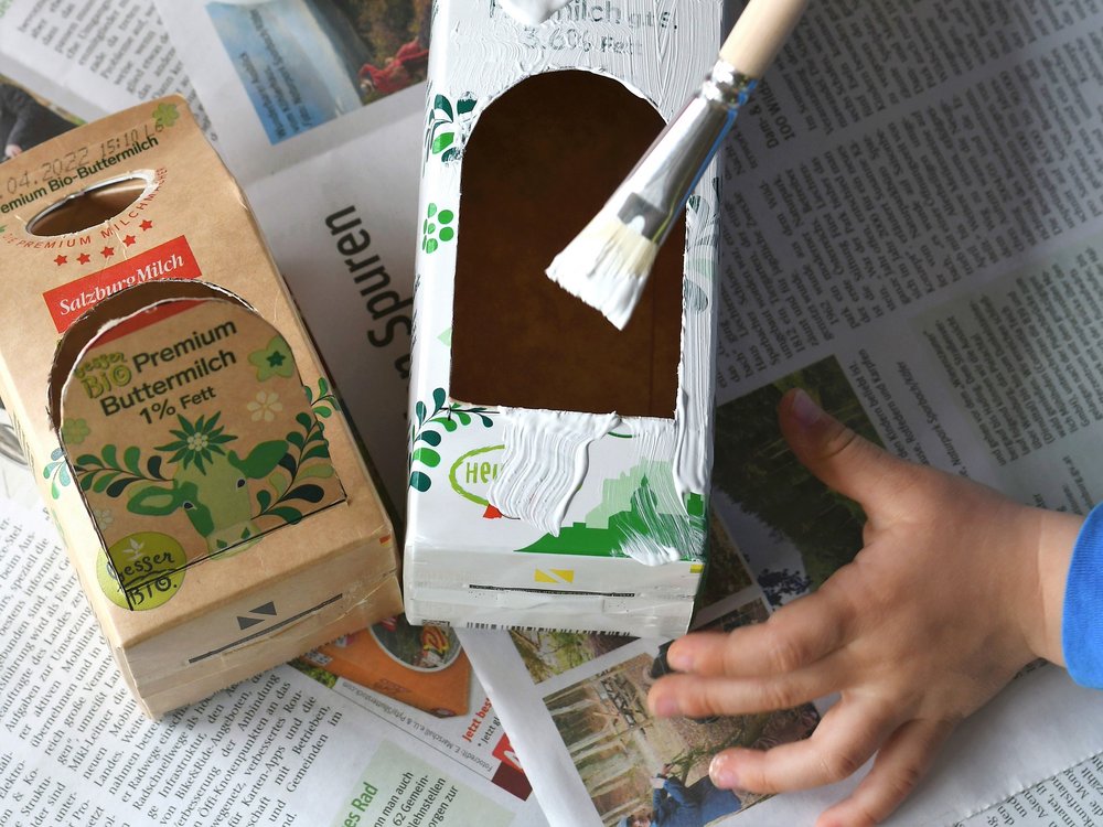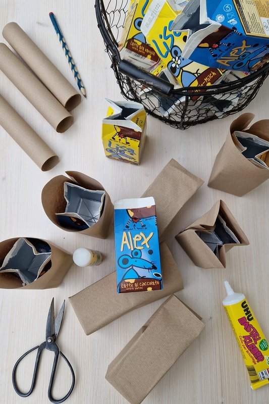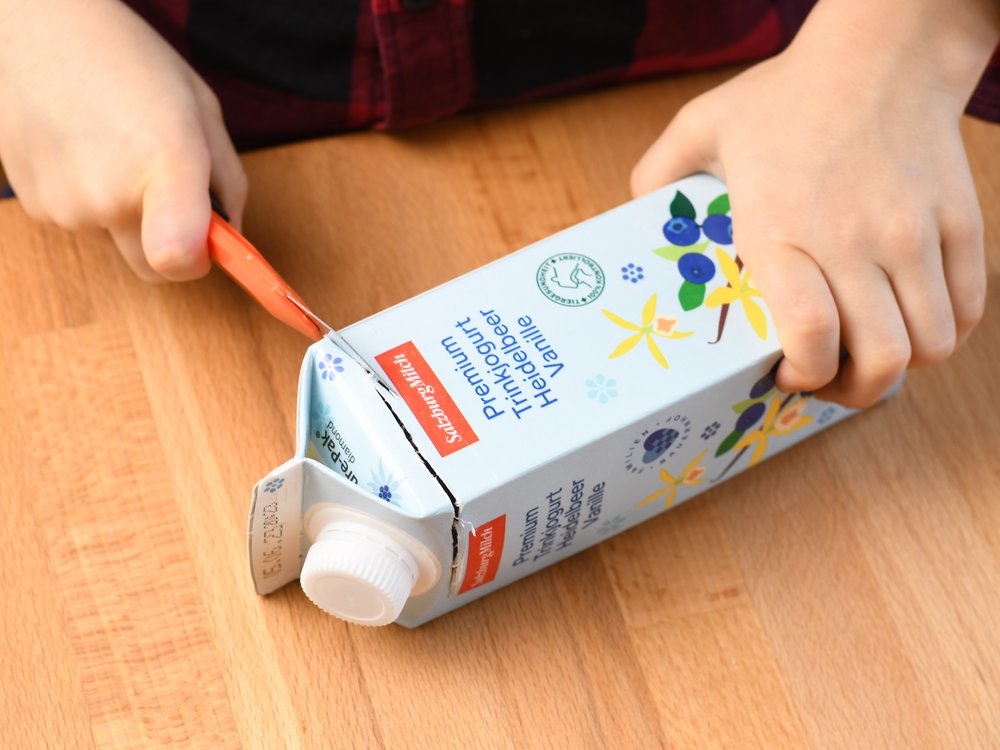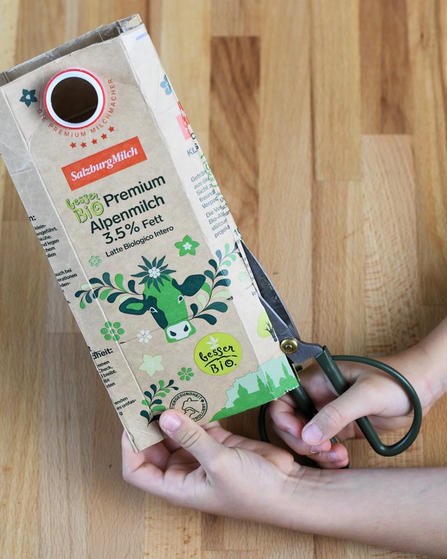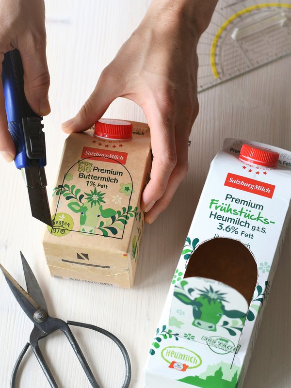 Die Milchkartons sauber auswaschen und trocknen lassen und den oberen Teil mit einem scharfen Messer abschneiden.
