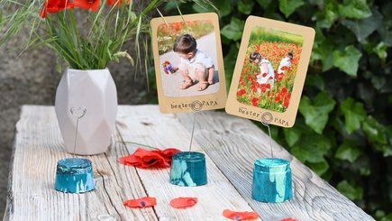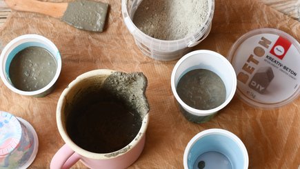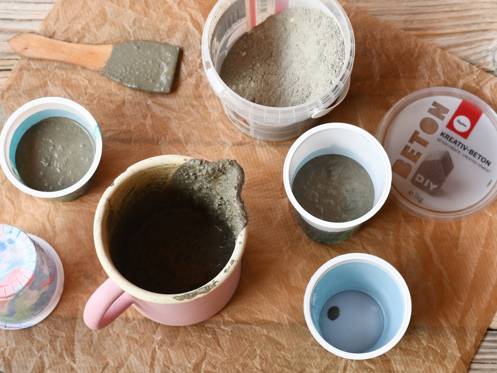 Kreativ-Beton nach Anleitung anrühren, in den Becher gießen, einige Stunden trocknen aber nicht ganz fest werden lassen. Mit einer dicken Nadel ein Loch in die Unterseite des Bechers bohren und Memo-Clip in den noch weichen Beton stecken. Beton vollständig aushärten lassen.