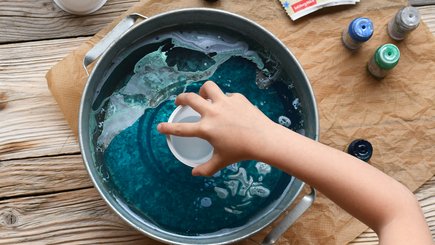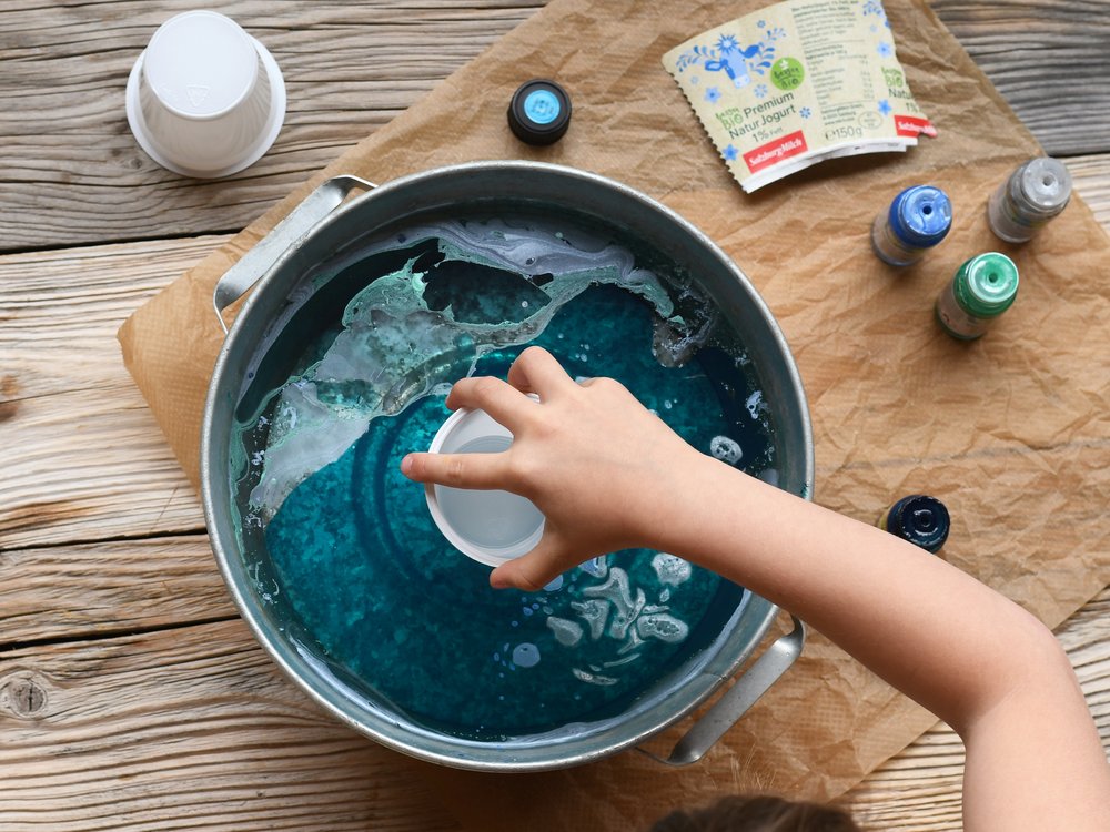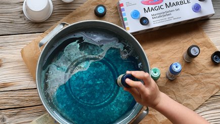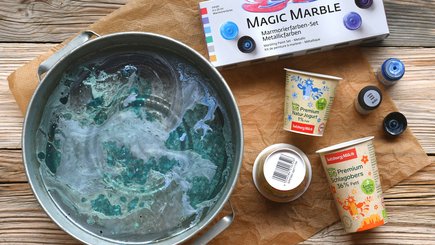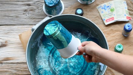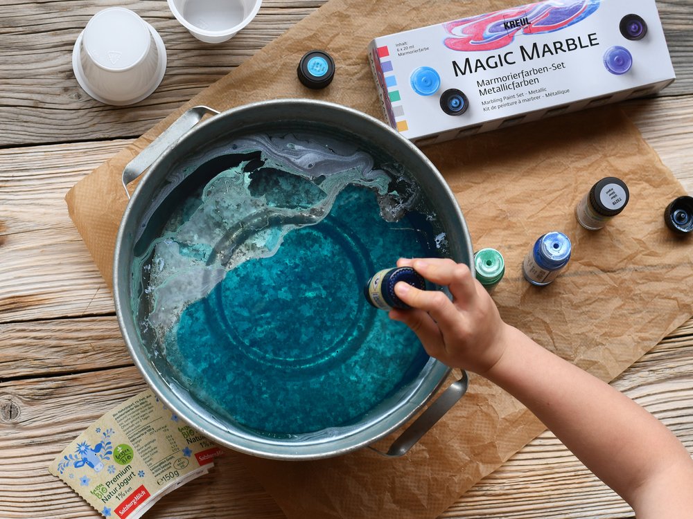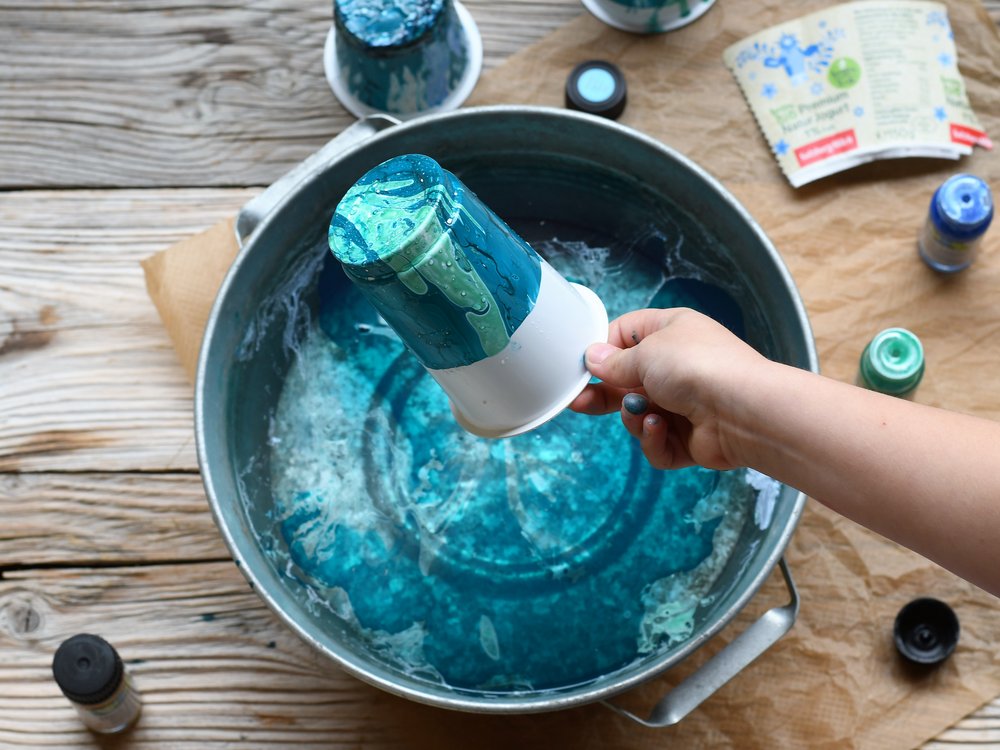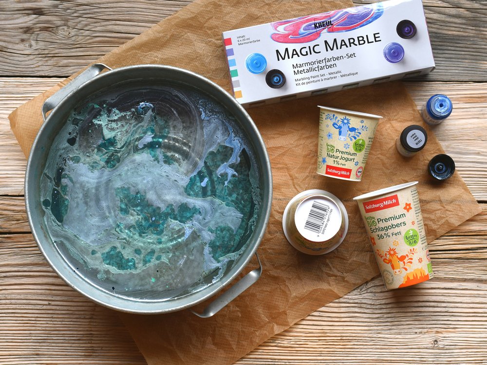 Alte Schüssel oder alten Topf mit Wasser füllen und Marmorierfarben hinein tröpfeln, bis ein schönes Muster entsteht.