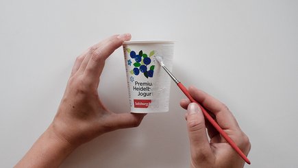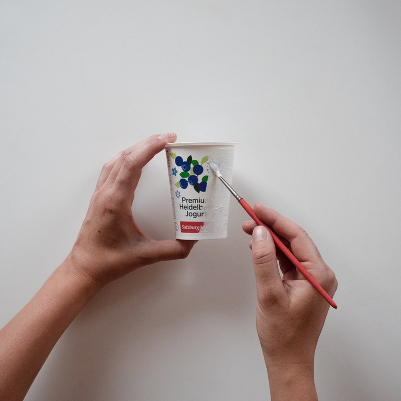 Male den Jogurtbecher mit weißer Wassermalfarbe an, bis er ganz weiß ist. Lass die Farbe trocknen.