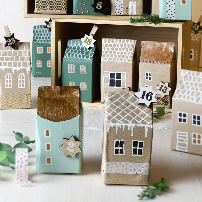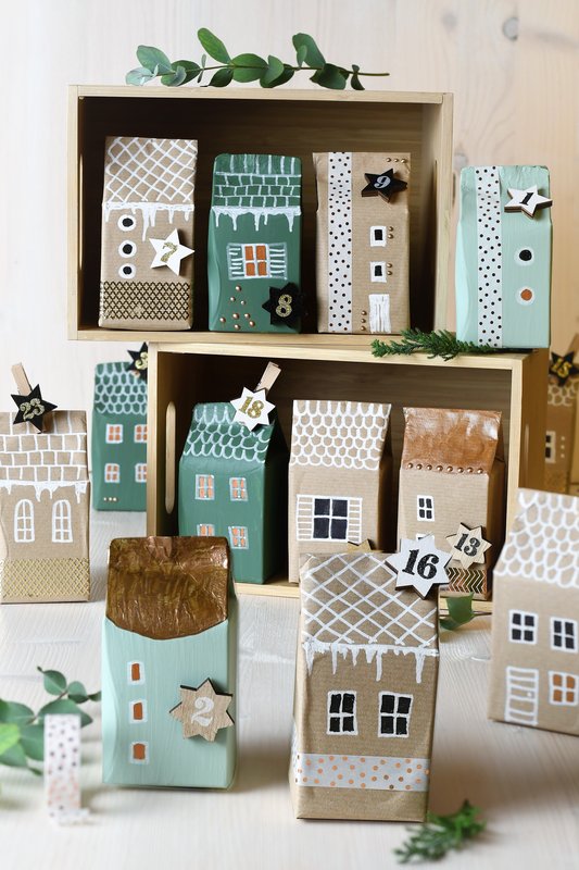 12 Milchkartons mit Acrylfarbe bemalen. Danach Milchkartons füllen und mit Heißklebepistole verschließen.