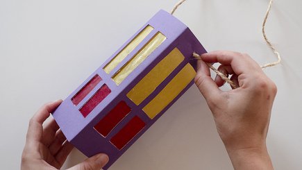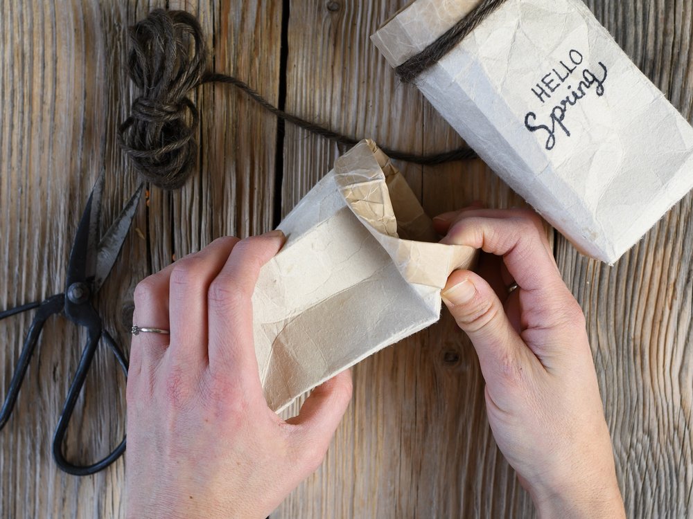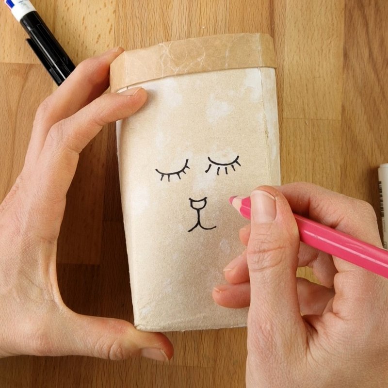 Den Karton nach Belieben mit Bändern, Holzperlen oder Naturmaterialien verzieren und mit Lackstiften Muster malen oder Sprüche schreiben.