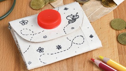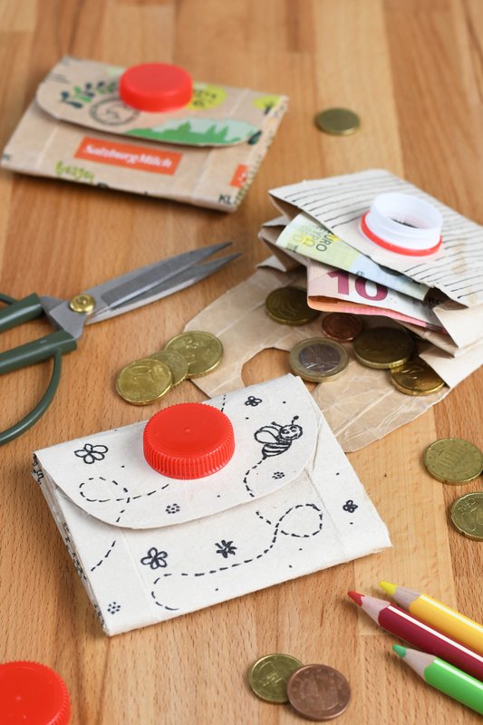 Falls du dein Geldbörserl verschönern möchtest, kannst du vorher die Folie vom Milchpackerl abziehen und es mit Hilfe von Lackstiften mit einem Muster deiner Wahl verzieren.