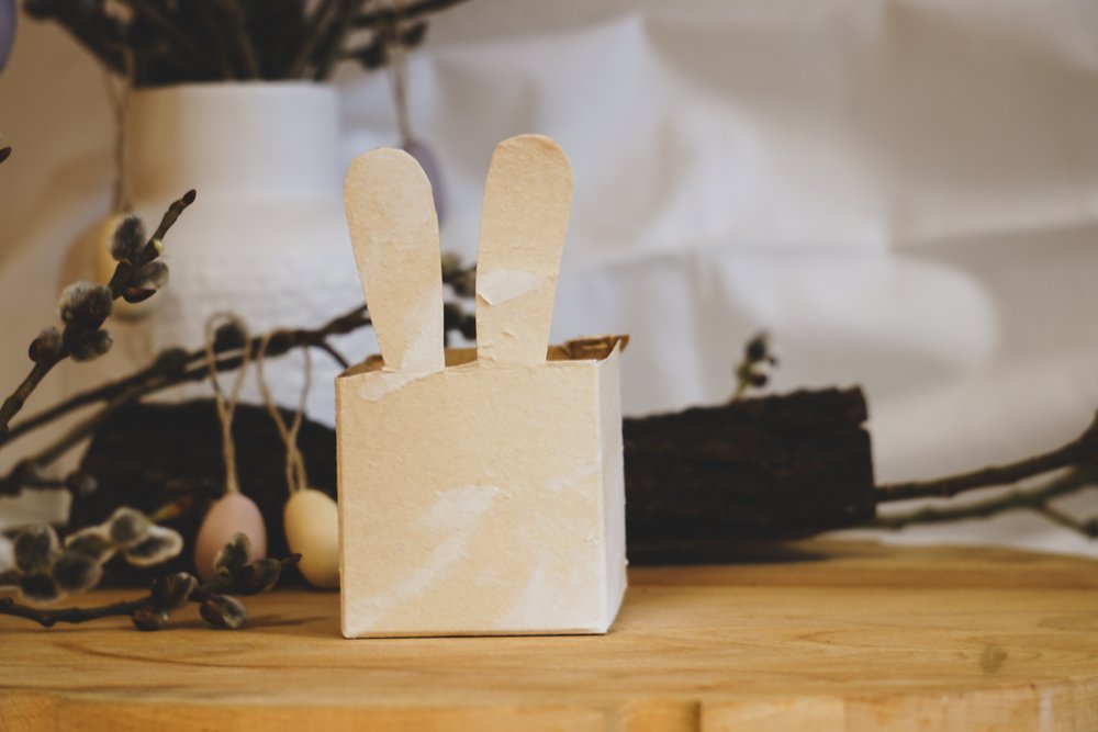 Auf der Vorderseite des Kartons ein Hasengesicht aufmalen.