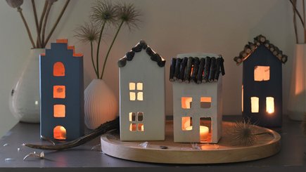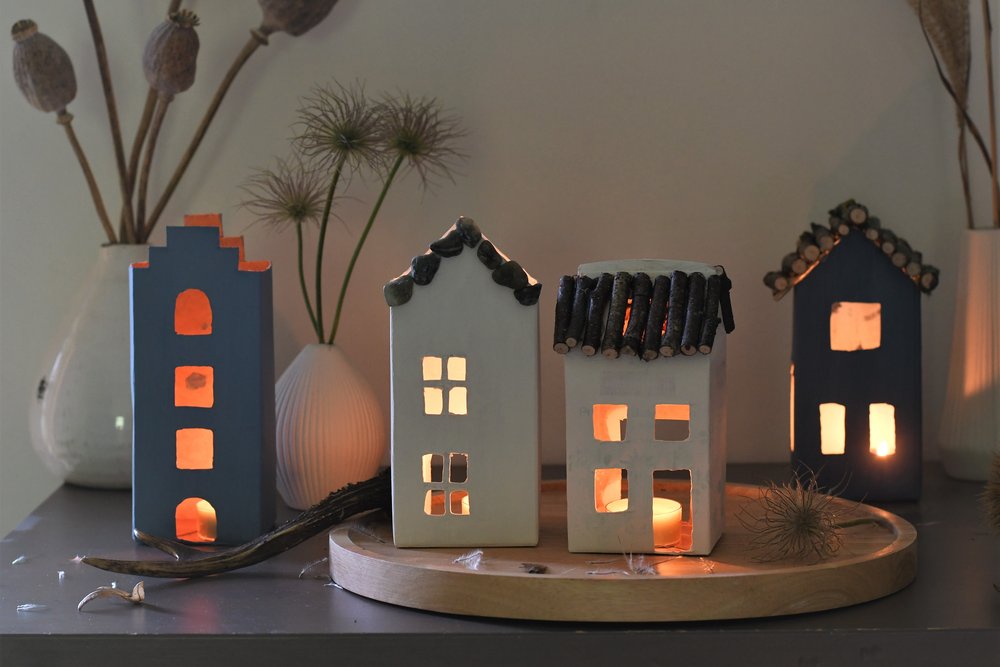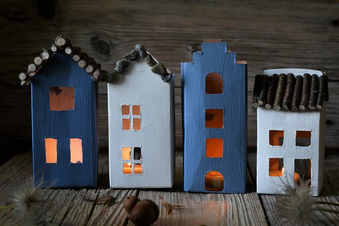 Stelle kleine LED-Teelichter in die Häuschen hinein und reihe sie auf der Fensterbank auf.