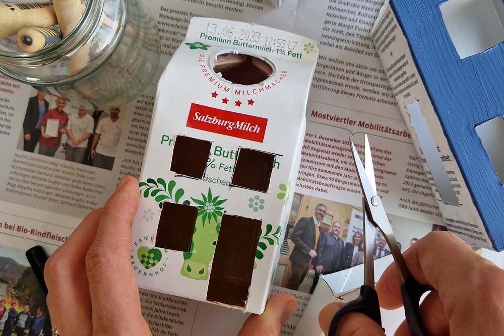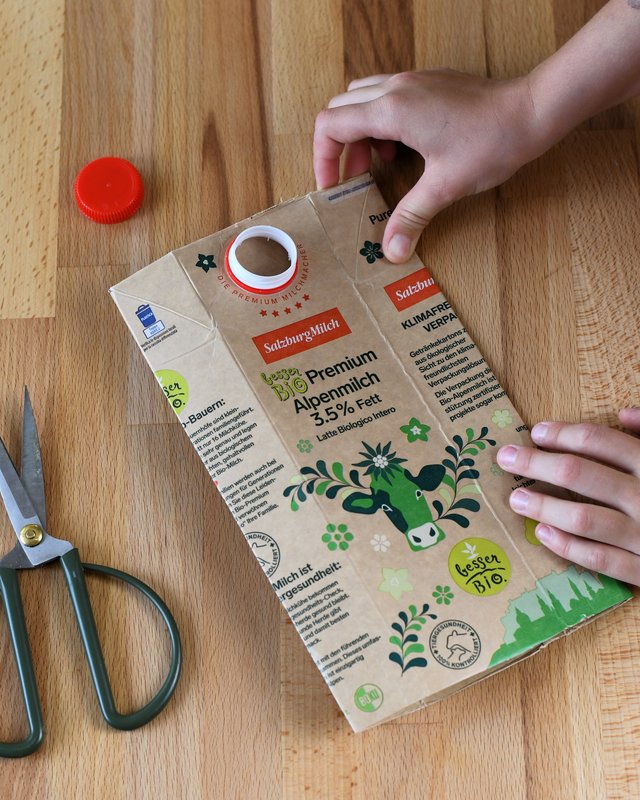Milchpackung gründlich ausspülen und den oberen Teil mit einem scharfen Messer abschneiden. (Für Vollansicht bitte auf das Bild klicken)