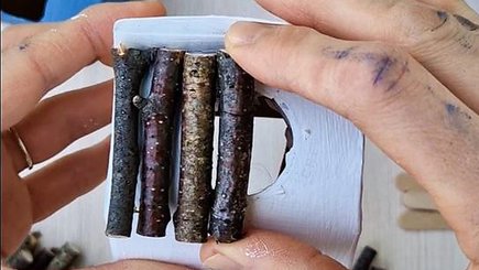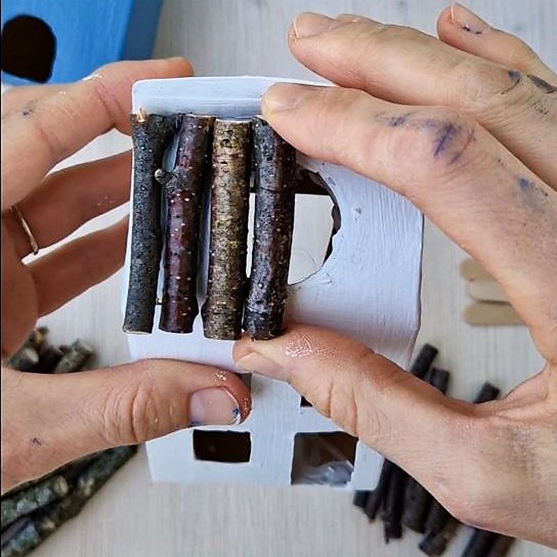 Schneide dünne Zweige in gleich lange Stücke und klebe sie mit der Heißklebepistole auf. Verziere die Häuschen nach Belieben mit kleinen Steinchen und sprühe sie mit Klarlack ein. Bitte einen Erwachsenen um Hilfe!