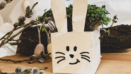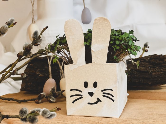 Kratze die oberste Beschichtung des Milchkartons an und entferne diese. Nun kannst Du etwas Watte oder Erde in den Karton geben, Kressesamen ansäen und diese befeuchten. Male zum Schluss noch ein Hasengesicht und warte bis die Sprossen sprießen.