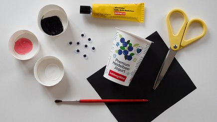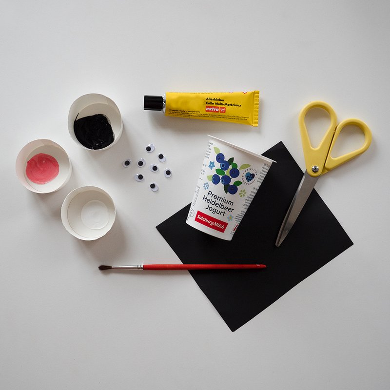 Folge der Schritt-für-Schritt-Aleitung und schon entstehen aus deinen Jogurtbechern lustige Kühe.