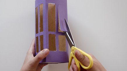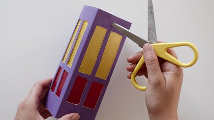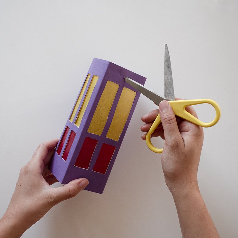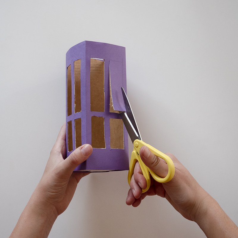 Schneide mit einer Schere oder einem scharfen Messer Dach, Fenster und Türen aus. Bitte einen Erwachsenen um Hilfe!