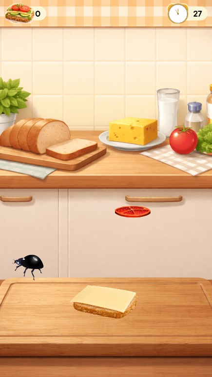 Sammeln Sie innerhalb von 30 Sekunden mit der Brotscheibe 15 Käse- oder Gemüsescheiben und belegen ein perfektes Käsebrot!