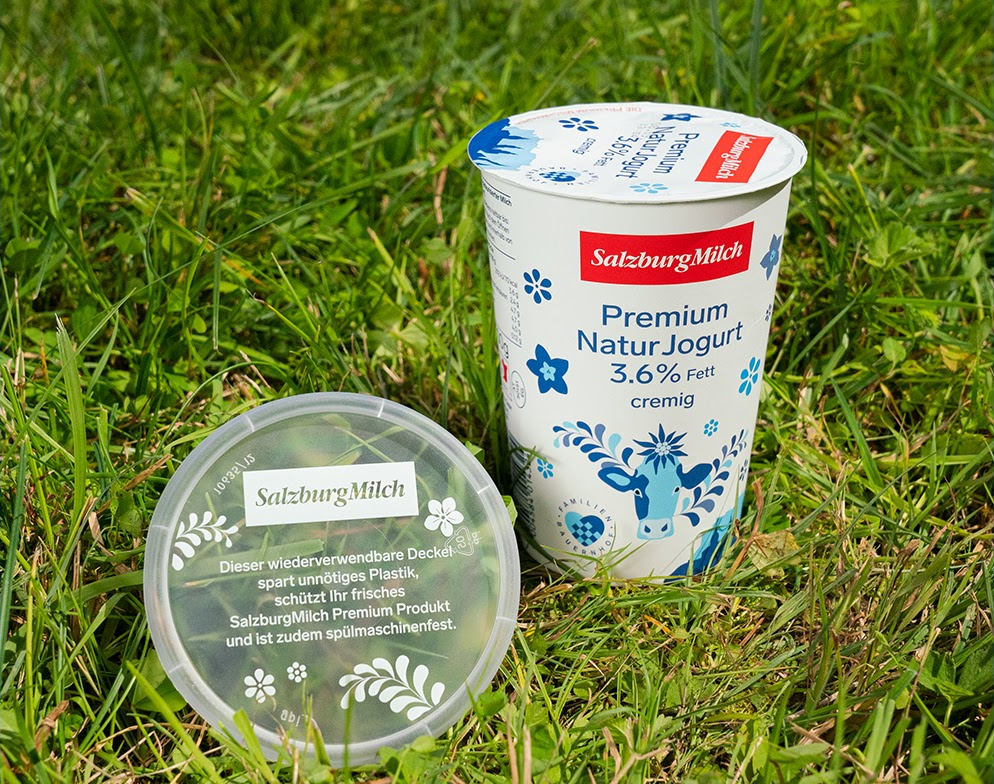 Dadurch können zukünftig alle SalzburgMilch 500g-Beher komplett ohne Stülpdeckel ausgeliefert und so jährlich weit mehr als 1 Million Einweg-Stülpdeckel Deckel und damit mehr als 3.ooo kg Kunststoff eingespart werden.
