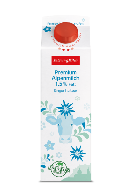 Zur besseren Unterscheidung der Milchsorten sind die Packungen der Premium Alpenmilch in unterschiedlichen Farben gehalten. Während die Premium Alpenmilch 1,5 % im hellblauen Design für fettreduzierten Milch-Genuss steht, vereint die Premium Alpenmilch 3,5 % im dunkelblauen Design längere Haltbarkeit und gleichbleibenden, vollmundigen Geschmack. Die Premium Frische Alpenmilch im roten Design überzeugt mit ihrem natürlichen, frischen und gehaltvollen Geschmack.  Alle Sorten der 100 % gentechnikfreien Alpenmilch sind in der anwendungsfreundlichen 1-Liter-Verpackung mit praktischer, großer Öffnung und rotem Schraubverschluss erhältlich.