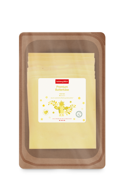 Wie alle Premium Käsesorten von SalzburgMilch wird auch der Premium Butterkäse ausschließlich mit mikrobiellem Lab hergestellt und ist durch seine natürliche Reifung laktosefrei.