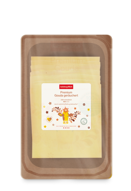Der Premium Gouda geräuchert ist ein halbfester rindenloser Schnittkäse mit 45% Fett i.Tr. (Fett absolut nur 25%), der seinn feines Räucheraroma durch Räuchern über Buchenholz erhält. Die fein geschnittenen Scheiben sind ideal fürs Jausnen aber auch zum Überbacken, Gratinieren und Verfeinern herzhafter Gerichte.