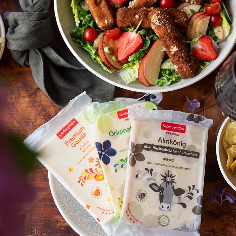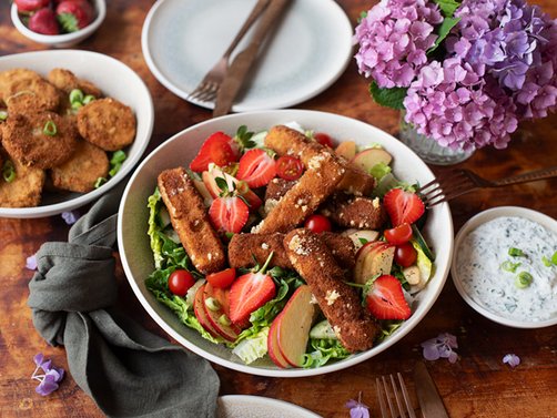 Die gebackenen Käsesticks und Zucchinischeiben auf einem bunten Sommersalat mit Kräuterdip servieren.