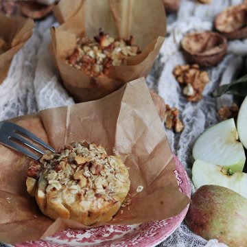 Den Teig in vorbereitete Muffinsförmchen gießen und mit der Nuss-Haferflockenmischung bestreuen.
