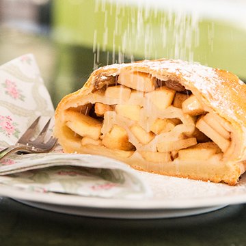 1/2 Stunde kalt stellen, ausrollen mit der Apfelmasse füllen, einrollen, mit Ei bestreichen und bei 170°C Heißluft ca. 30-40 min goldgelb backen.