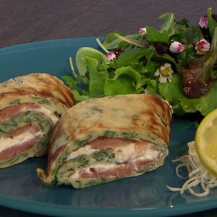 Den Palatschinken ausreichend mit Räucherlachs belegen und mit der Fülle bestreichen und wieder einrollen.