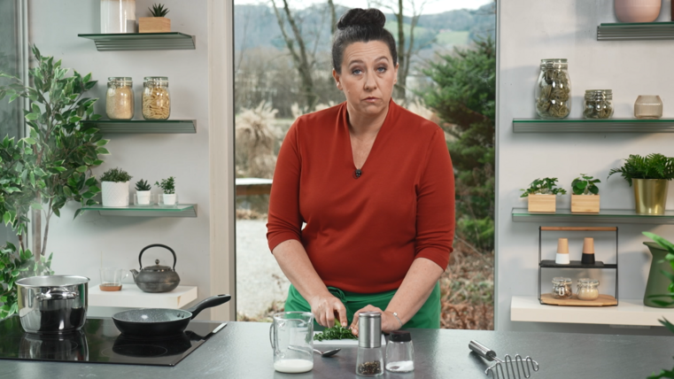 In der Zwischenzeit den Bärlauch waschen und in dünne Scheiben schneiden, danach den Bärlauch in der Butter anrösten.