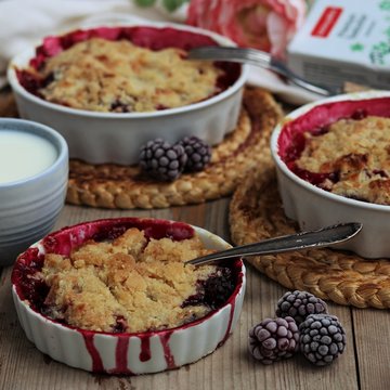 Das Crumble wird bei 200°C etwa 25 Minuten gebacken. Wenn die Brösel eine goldbraune Farbe angenommen haben, ist das Beeren-Apfel-Crumble fertig.