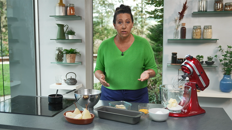 Den Teig in eine gefettete Kastenform füllen. Die Birnen sehr dicht nebeneinander in den Teig drücken (aufgestellt).