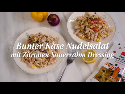 Für das Dressing alle Zutaten miteinander verrühren. Den Käse-Nudelsalat mit dem Zitronen-Sauerrahm-Dressing garniert servieren.