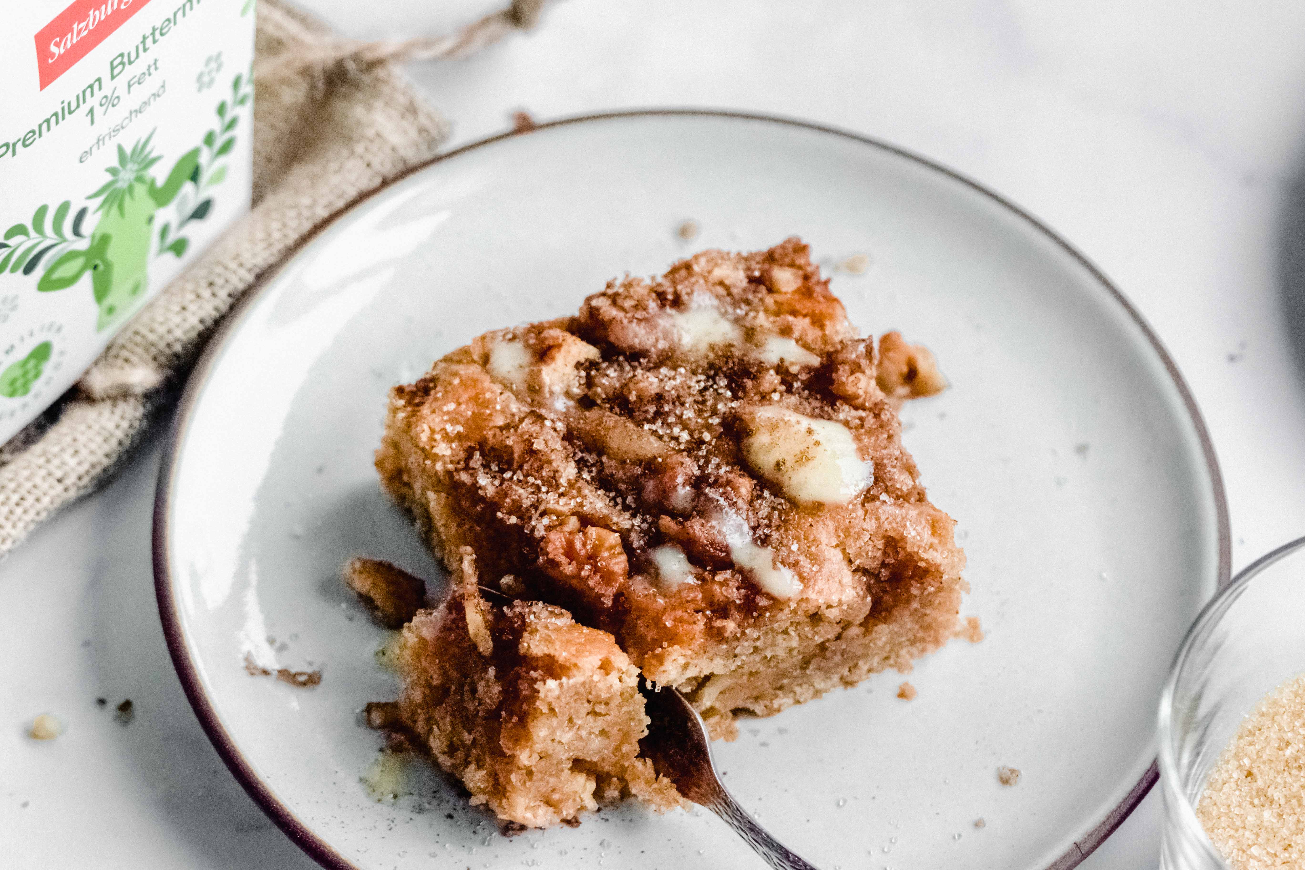 Der Apfel-Buttermilchkuchen schmeckt sehr gut mit einer Kugel Vanilleeis oder aufgeschlagener Sahne.