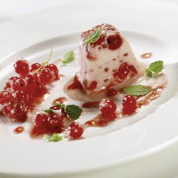 Abschließend die Förmchen kurz in heißes Wasser tauchen und auf einen Teller stürzen, die Folie abziehen und das Ganze mit Sauce, Ribisel und Zitronenmelisse garnieren.