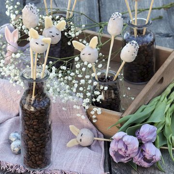 Die Schokostreusel werden mit Hilfe einer Pinzette als Augen auf die noch feuchten Schokocakepops geklebt. Mit Hilfe von halben Zahnstochern werden die Hasenohren fixiert.