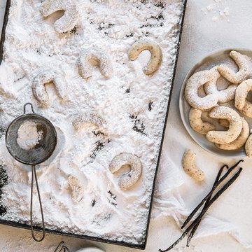 Anschließend abkühlen lassen und dann mit einem Gemisch aus Vanillezucker und Staubzucker bestreuen — am schnellsten geht das mit Hilfe eines kleinen Siebs.