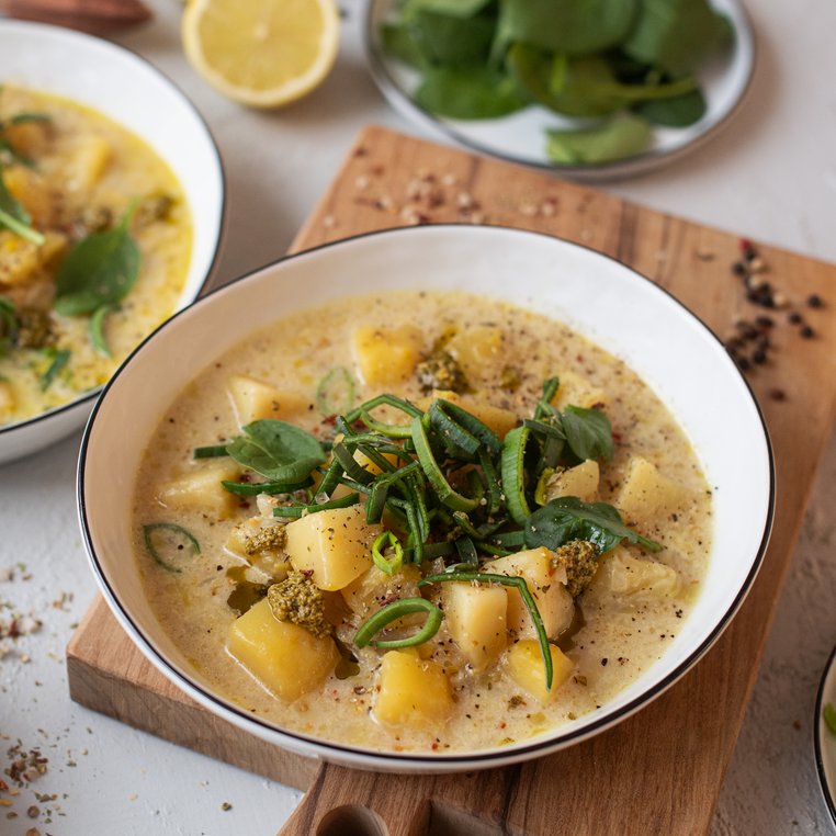 Die Kartoffeln unterrühren, mit der Gemüsebrühe aufgießen und alles etwa 15 bis 20 Minuten sanft köcheln lassen, bis die Kartoffeln weich sind.