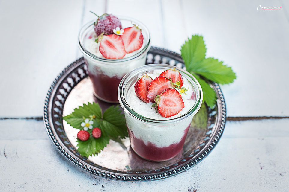 Das Erdbeermark ca. einen Zentimeter hoch in Gläser füllen, mit der Grieß-Topfenmischung bedecken und für ein paar Stunden im Kühlschrank durchkühlen lassen.