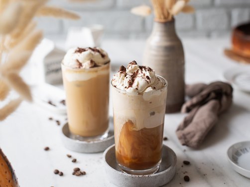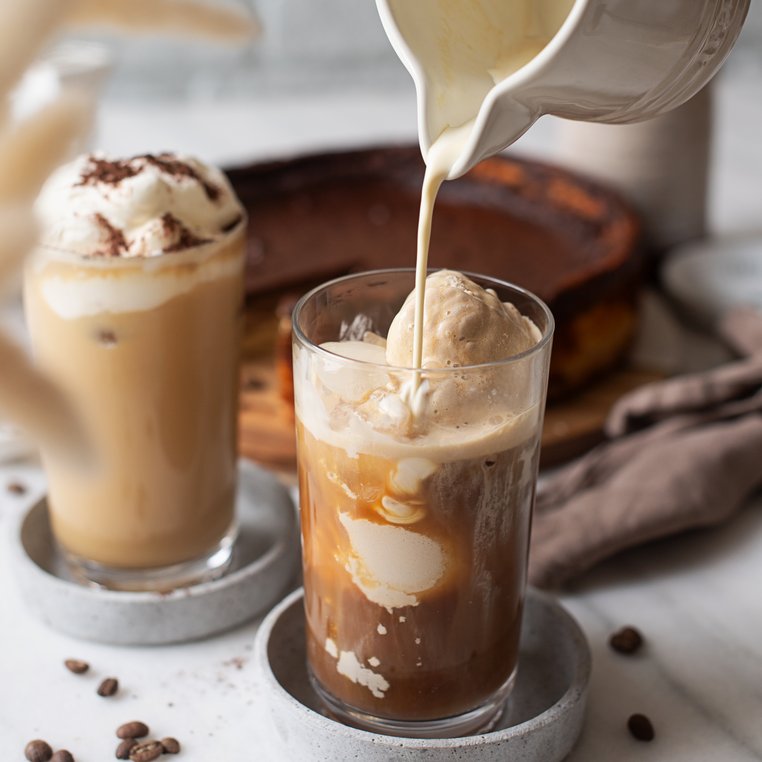 Zwei bis drei Esslöffel gekühlten Kaffee in ein hohes Glas geben. Zwei Eiskugeln pro Glas hinzufügen und den restlichen Schlagobers auf die beiden Gläser aufteilen und weitere zwei bis drei Esslöffel gekühlten Kaffee dazugeben.