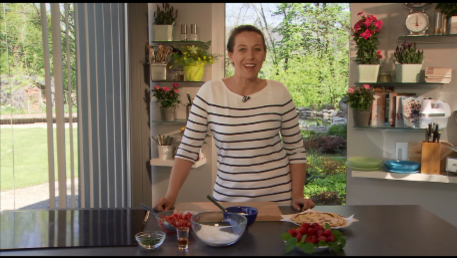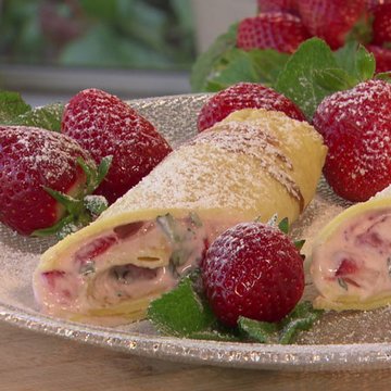 Die Palatschinken mit etwas Sauerrahm bestreichen und die Erdbeeren darauf verteilen.