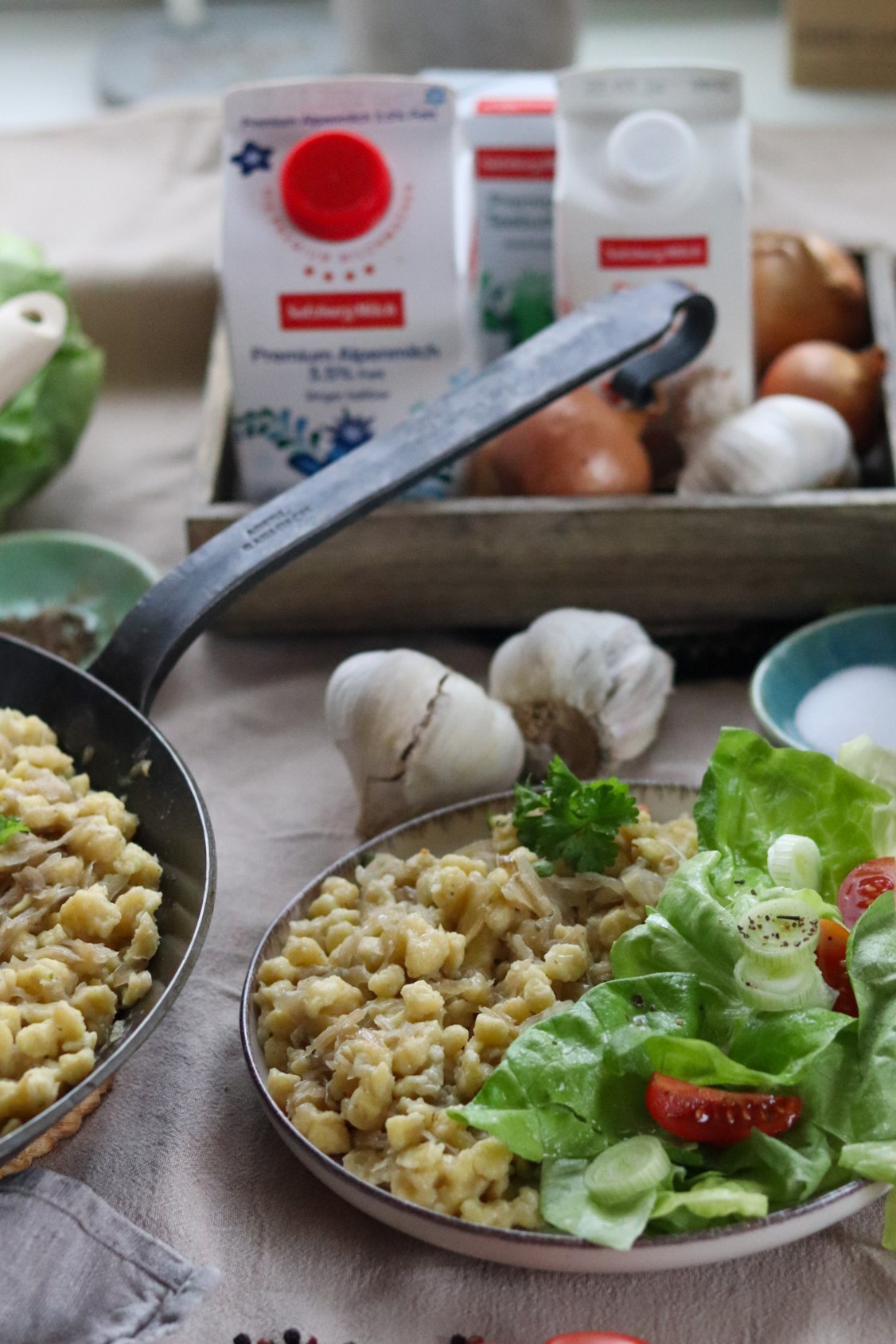 Für die Nockerl die Milch mit den Eiern verschlagen. Mit Salz und Muskatnuss abschmecken.