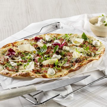 Ganz dünn ausrollen und mit dem Belag belegen.