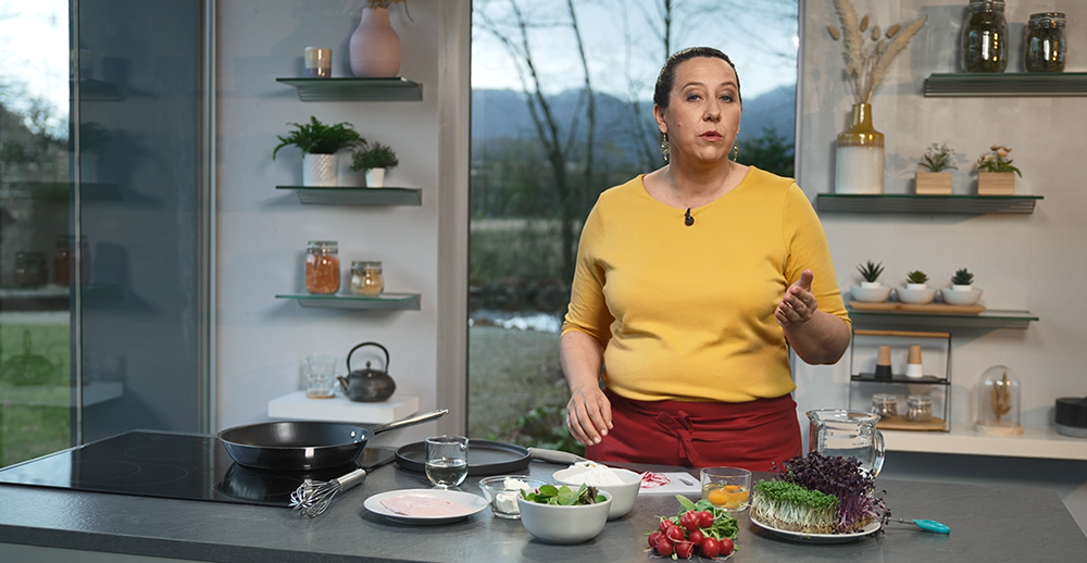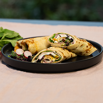 Palatschinken mit Frischkäse bestreichen und mit Schinken, Kresse und dünn geschnittenen Radieschen belegen und einrollen.