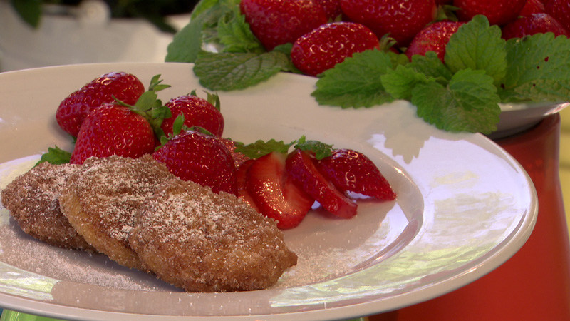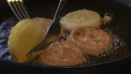 In kleine Stücke schneiden, in den verquirlten Eiern wenden und im heißen Fett goldgelb backen.