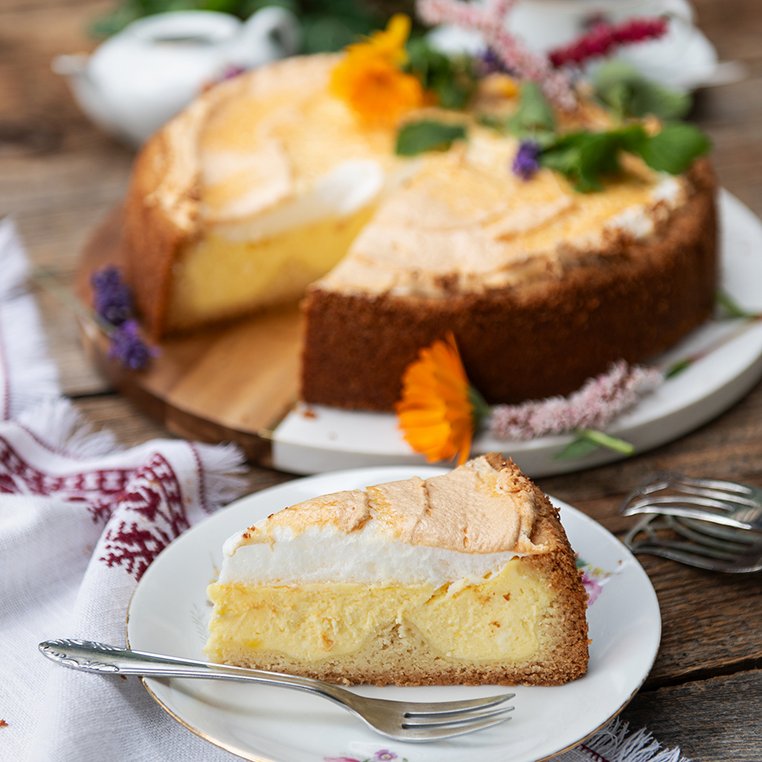 Die Torte aus dem Ofen nehmen, den Eischnee darauf verteilen und die Topfentorte für rund 15 Minuten weiterbacken.