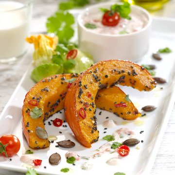 Den Kürbis waschen, in Scheiben schneiden, mit Öl, feingehacktem Chili, Sesam, Salz und gemahlenem Bockshornklee marinieren und im Backrohr bei 200 °C ca. 20 Minuten grillen.