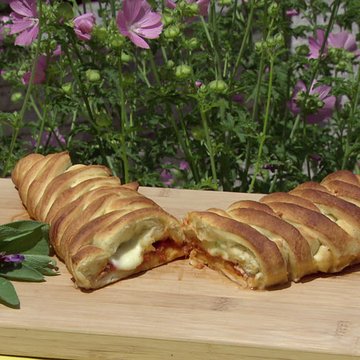 Nun die Streifen abwechselnd von rechts und links über den Belag legen. Die geflochtene Pizza 20 bis 25 Minuten im Backofen goldbraun backen.