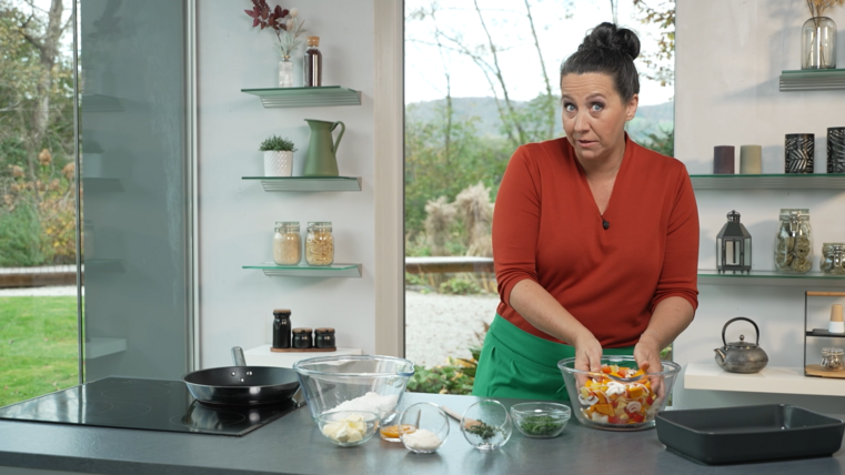 Die Gemüsemischung in kleine Förmchen füllen und die Streusel darüber verteilen.