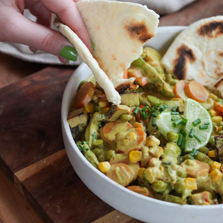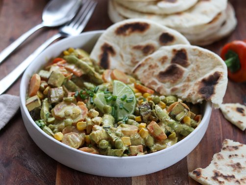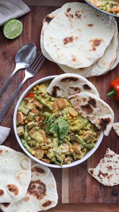 Das Curry gemeinsam mit dem Naan Brot servieren.