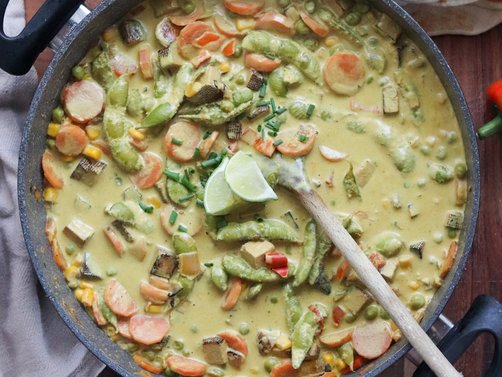 Kurz unter Rühren anbraten und mit der Gemüsebrühe ablöschen. Das Gemüse bei kleiner Hitze bissfest garen.