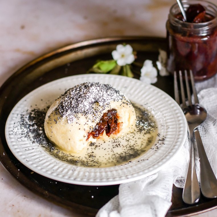 Die fertigen Germknödel mit flüssiger Butter übergießen, mit 1 EL Mohn-Zucker-Mischung bestreuen und heiß servieren.