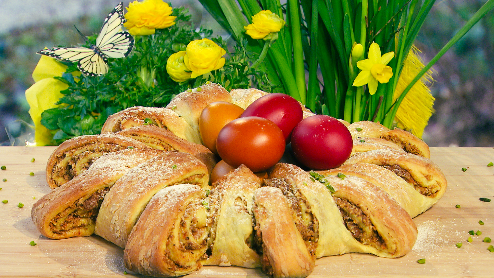Danach den Kranz mit Ei bestreichen und bei 190 Grad gut eine halbe Stunde backen.